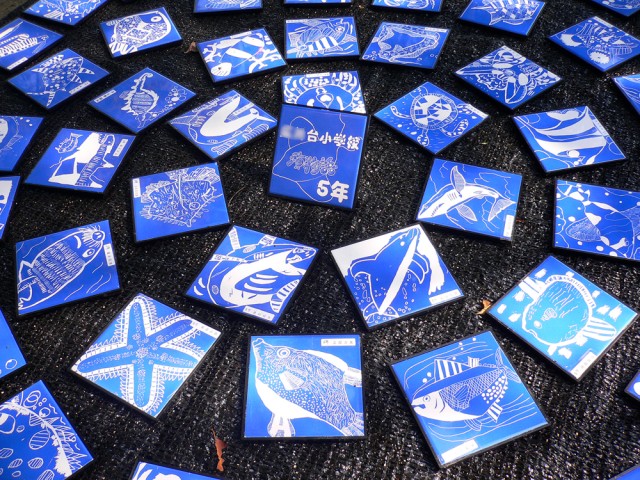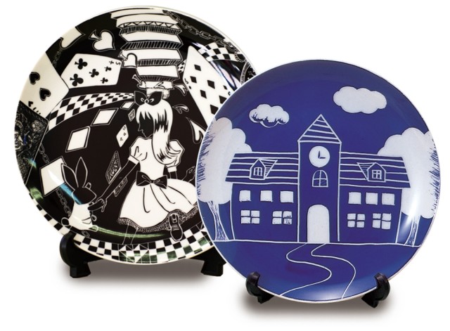白い陶器の皿・タイルに色釉薬が塗ってありますので